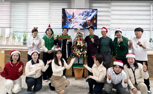 | 8ÀÏ »ê¿Ü¸éÇàÁ¤º¹Áö¼¾ÅÍ Á÷¿øµéÀÌ Ã»»ç ³» Å©¸®½º¸¶½º Æ®¸® ¾Õ¿¡¼ »êŸ¸ðÀÚ¸¦ ¾²°í Æ÷Á ÃëÇÏ¸ç ±â³äÃÔ¿µÀ» Çϰí ÀÖ´Ù. |